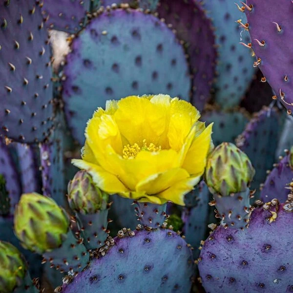 Opuntia gosseliniana Santa Rita is een aparte verschijning mede door zijn kleur. Deze mooie Cactus maaktzeer aparte schijven die rood of paars-violet worden. De cactus geeft gele bloemen en zijn in het voorjaar zeker een eye-catcher. De bloemen bloeien van april tot eind augustus.