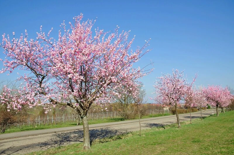 De Prunus dulcis is een amandelboom die bloeit in maart/april met witroze bloemen. De oogstijd van deze boom is in september met kleine abrikoosachtige vruchten waarin de amandelpit zich bevind. De boom is redelijk winterhard maar wel bladverliezend.